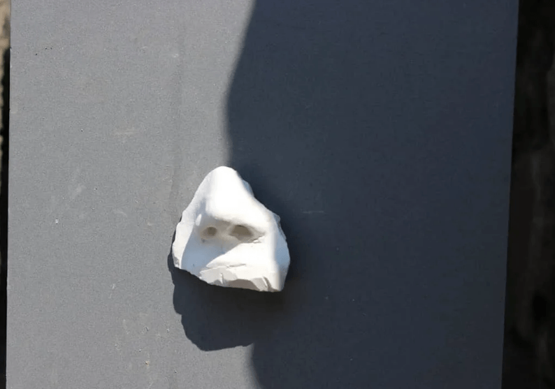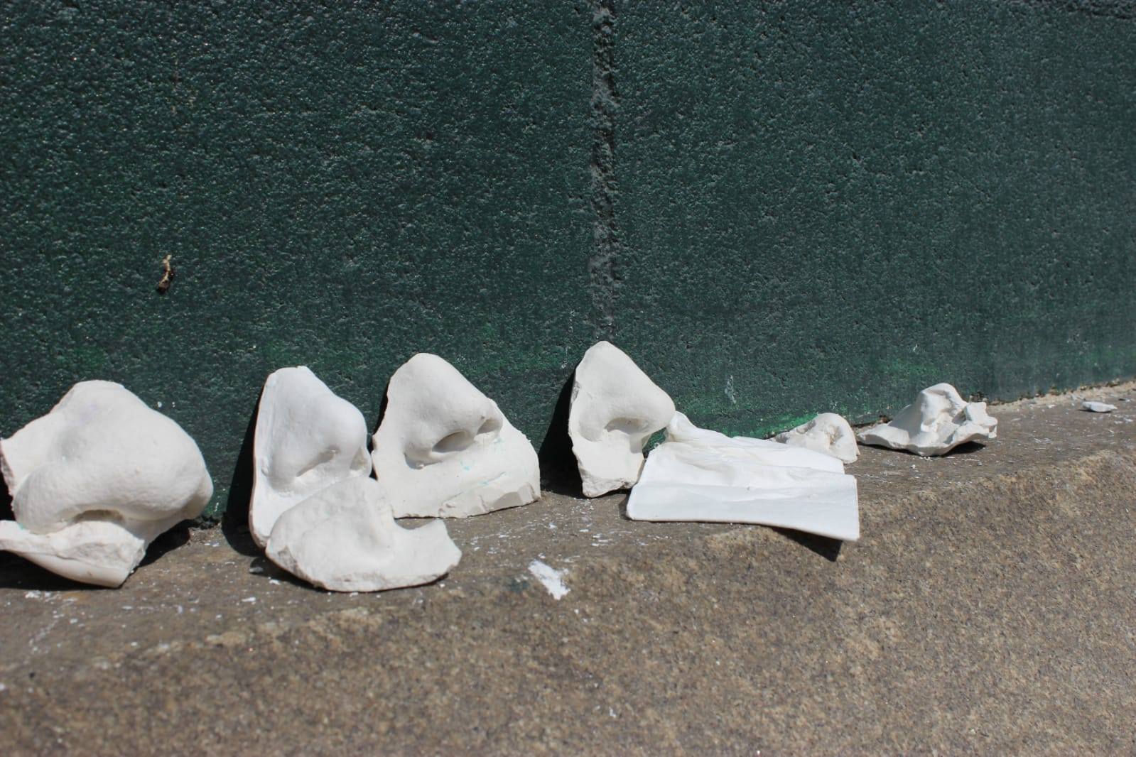 Por ello decide cubrir una pared con reproducciones de diferentes narices, para señalar, marcar y remarcar que algo huele mal que algo apesta. Porque nadie tiene el derecho de amedrentar a otra persona para hacer con ella lo que quiera.
