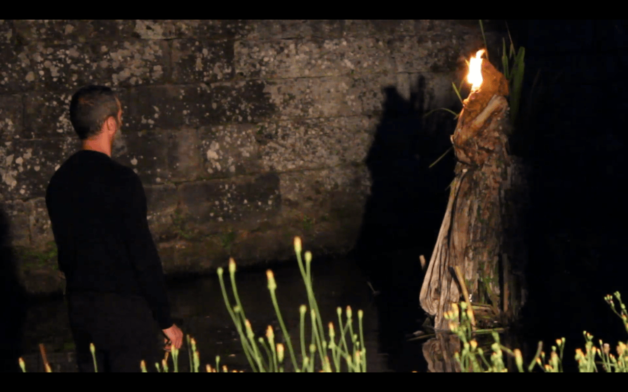La acción es un ritual musical, consiste en presentar este cuerpo/pedestal en el interior del río Umia, los espectadores acompañados por la música del chelo verán desde el margen del río como es colocado el busto y como son encendidas las mechas del mismo, viendo como la escultura llora su propio rostro mientras nos ilumina.